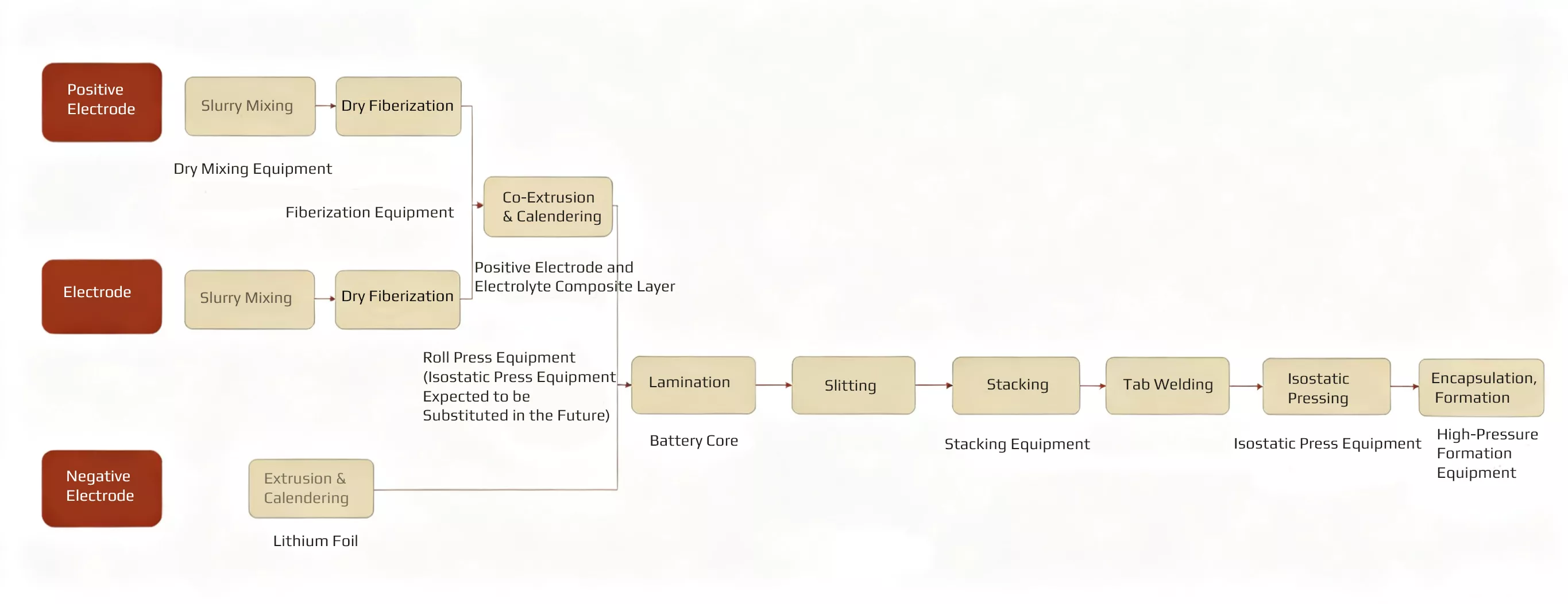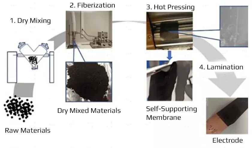 Dry-process electrodes are formed by uniformly mixing active materials, binders, and conductive agents in a solvent-free environment, fiberizing them, and then rolling them onto a current collector. Compared to wet-processes, dry-process electrodes are more suitable for sulfide electrolytes and offer advantages such as higher energy density, lower costs, and improved production efficiency.