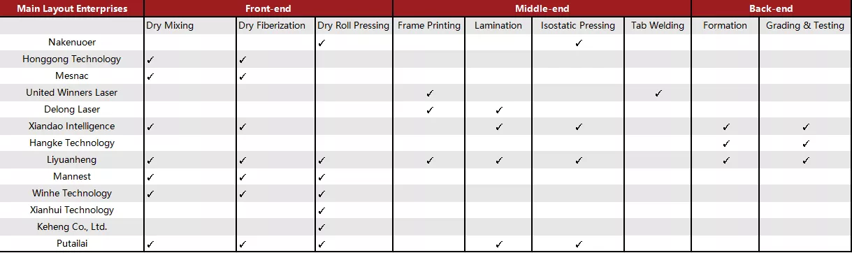 | Liyuanheng | Liyuanheng has overcome key technologies including dry electrode coating equipment, electrode roll pressing & electrolyte thermal composite integrated machine, rubber frame printing & lamination integrated machine, and high-voltage formation & grading equipment. |